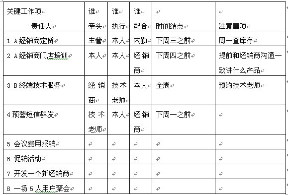 上述工作計劃表格載明了關(guān)鍵工作項、責(zé)任人分工、時間結(jié)點以及注意事項,一線銷售人員思路清晰、行動準(zhǔn)確,同時作為銷售主管輔導(dǎo)檢查的依據(jù)。