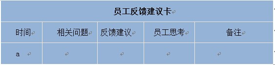 既然我們要求每一個(gè)員工都要隨時(shí)發(fā)現(xiàn)問題,隨時(shí)反饋問題,“好記性不如爛筆頭”,那么設(shè)計(jì)一張表格進(jìn)行記錄是最好的選擇。下表就是一張員工反饋問題建議卡。