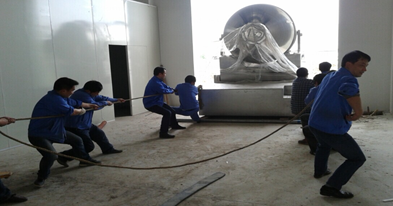 在新車間的設備安裝與定位的過程中,受一些不可避免因素的影響,很多棘手的困難總是突如其來。例如,新車間的功能間已隔離完畢,車間的外圍已封閉、定型。然而,外面的道路卻還沒有完全填平、硬化,那么怎樣將一臺6噸多重二維混合機準確、安全定位?困難擺在眼前,大家聚集在一起,商討對策。用叉車,道路和門的尺寸都不夠高,叉車無法進入;請吊車,車間外圍已封閉定型,吊車也愛莫能助!最終,大家提議利用滾動的方式對二維混合機進行定位。