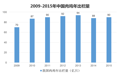 2009-2015年,中國肉雞年出欄量從2009-2011年高速增長后增長放緩,年出欄量保持平穩(wěn)中小幅調(diào)整的趨勢。肉雞是最便宜的動物蛋白食品。